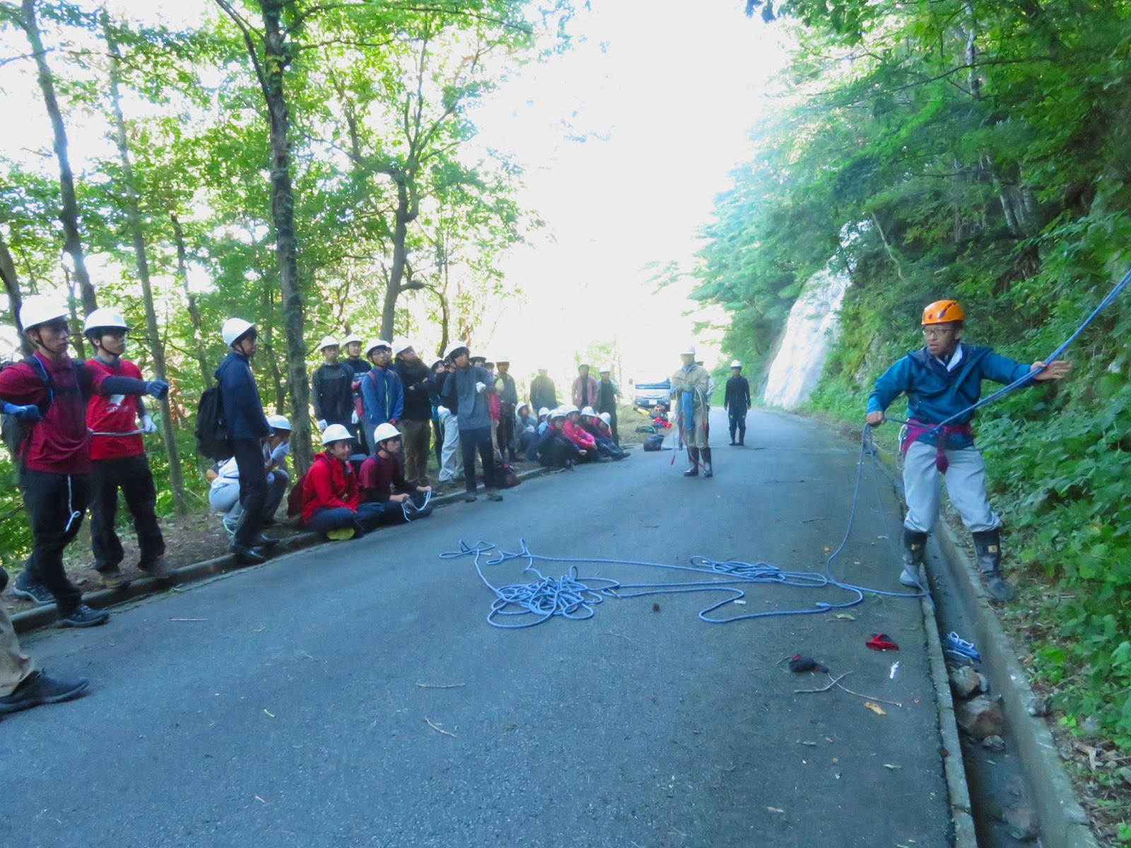 4泊5日の行程で、救急救命法・オフロードや事故時の自動車操作法・地図読み及び登山・ロープワーク・木登り・崖登り・野営などなど、盛りだくさんの内容をこなします。今回は、新潟大学農学部と理学部に所属するフィールド科学人材育成プログラム 21名、農学部流域環境学プログラム 9名、山形大学と京都大学から各 2名の学生が参加しました。